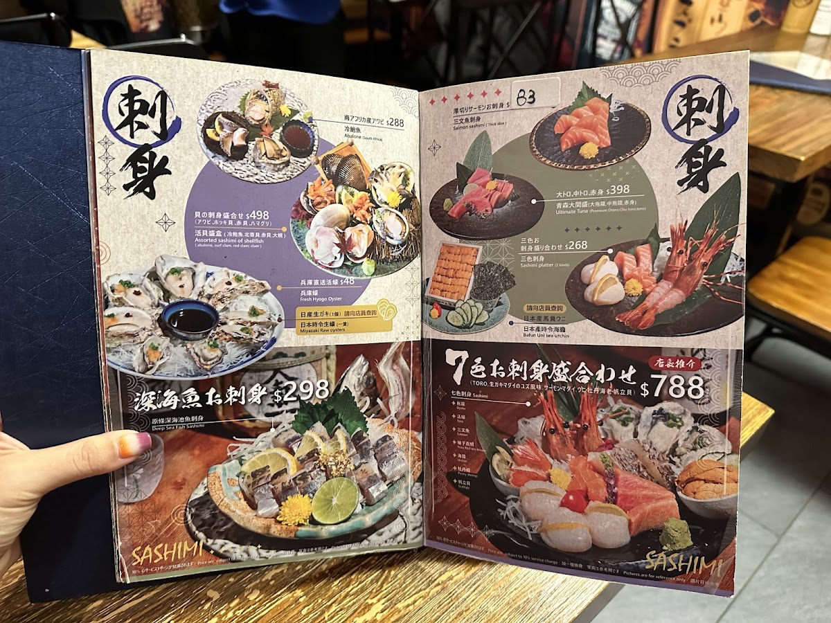 拖羅、活蠔、三文魚、柚子真鯛、海膽、牡丹蝦、帆立貝及粒貝